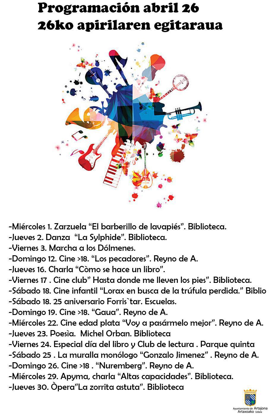 Estas son las actividades programadas para el mes de abril organizadas por el Ayuntamiento de Artajona, con propuestas culturales variadas que incluyen zarzuela, danza, cine, charlas, poesía y eventos especiales para todos los públicos.